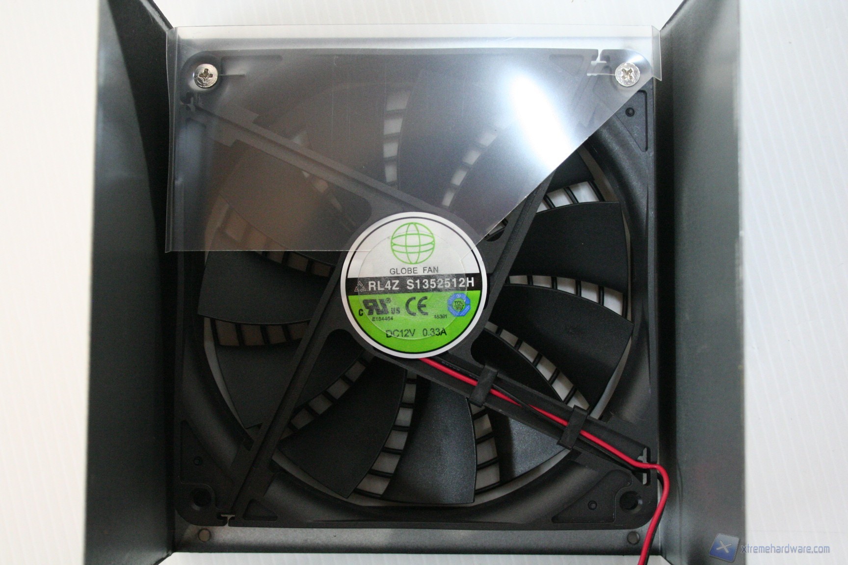 La ventola è il modello Globe Fan RL4Z S1352512H DC12V 0.33A, da 140mm ed avente un RPM massimo di 1500 (+/- 10%), capace di generare un flusso d'aria di 119.8 CFM. Il PCB delle connessioni modulari è posizionato quindi sulla sinistra, e non presenta particolari degni di nota in quanto ospita solamente i connettori.