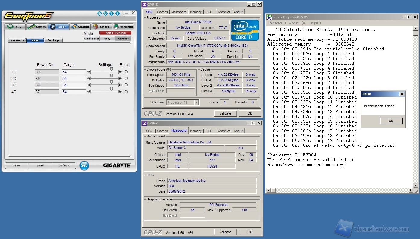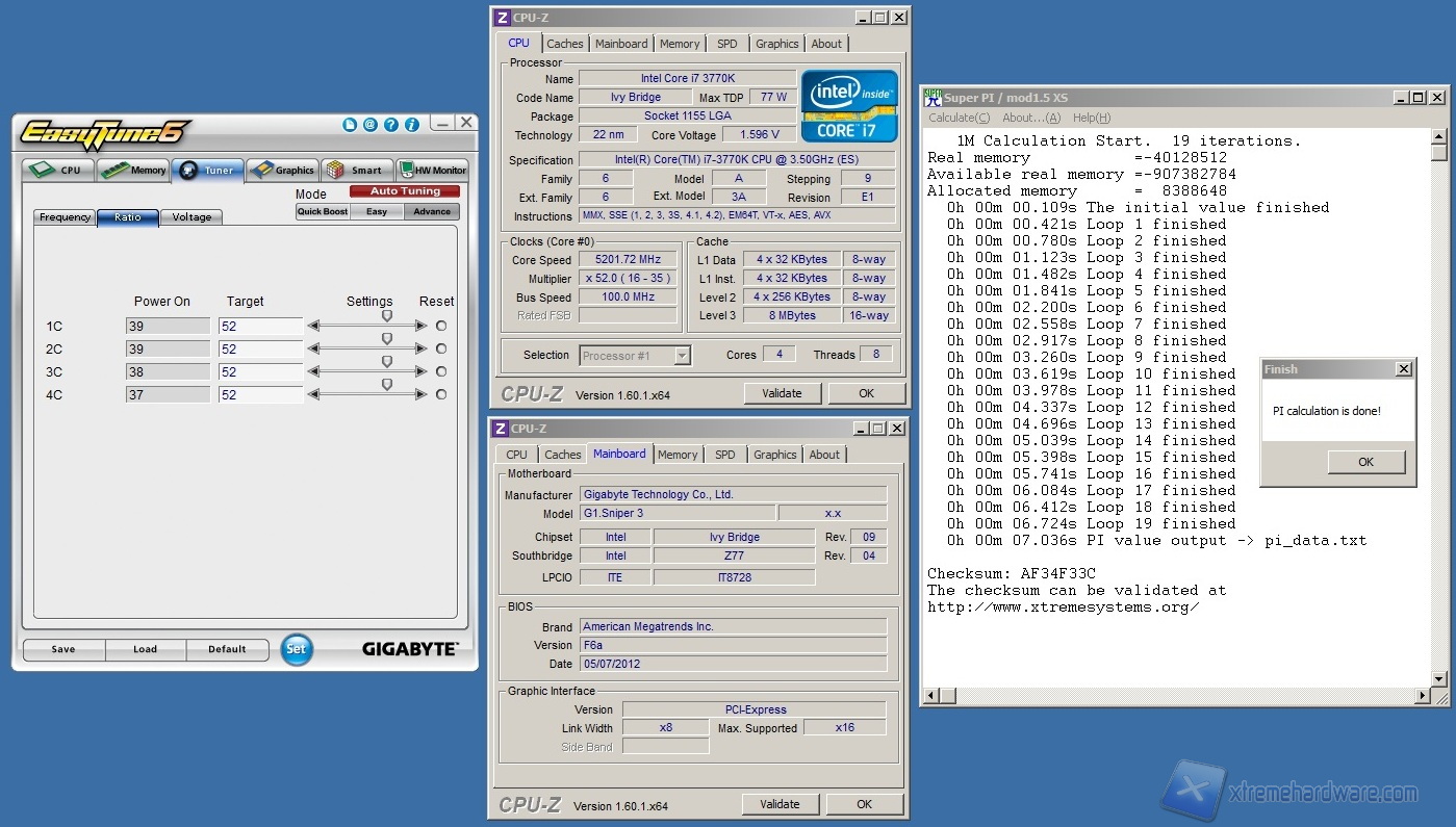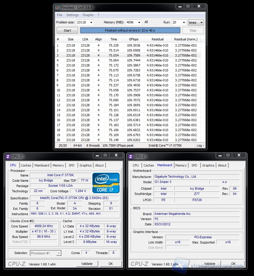 Soffermatevi sul valore GFlops di picco indicato nello screen, valore di tutto rispetto a questa frequenza, conseguenza dell’ottimo lavoro svolto sia da Intel con Ivy Bridge che ne ha potenziato l’ALU, sia dell’ottimo sistema di alimentazione della GIGABYTE G1.Sniper 3 che ha richiesto un voltaggio non particolarmente elevato ed entro i limiti consigliati da Intel. I test di overclock nell’utilizzo quotidiano hanno dimostrato un’ottima propensione della scheda verso questa pratica, permettendo con facilità di raggiungere la nostra frequenza target di 4.7 GHz con un Vcore molto contenuto rispetto alle altre schede testate. Anche la stabilità sotto carico si è dimostrata impeccabile, segno di una sezione di alimentazione di ottima qualità, seppur di vecchia generazione.