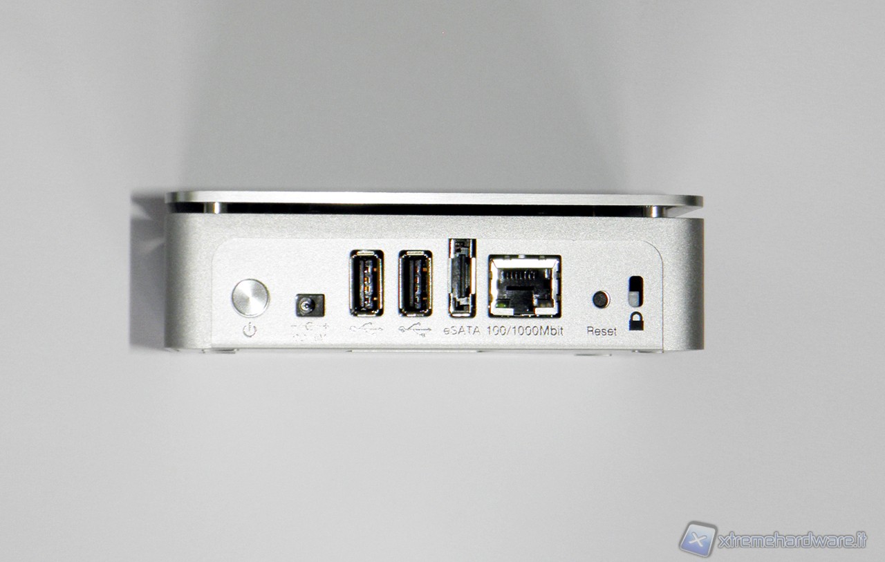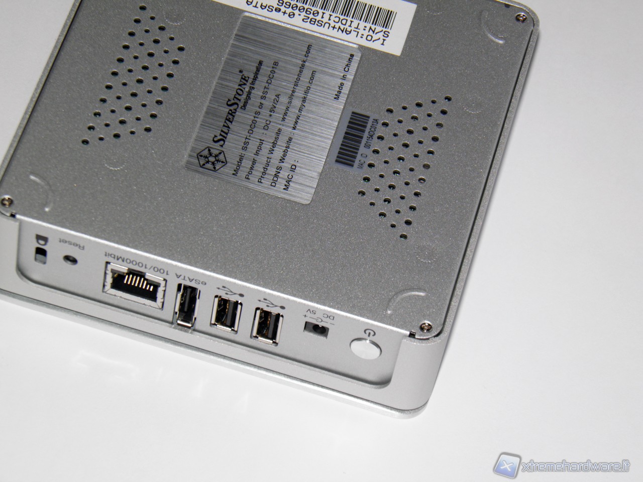 Posteriormente sono presenti le porte di connessione, abbiamo una GigaLan, una porta eSATA 2.0 e due porte USB 2.0. Su queste è possibile collegare dispositivi come PenDrive, HDD, e stampanti. Non sono utilizzabili per la connessione del NAS stesso al pc.